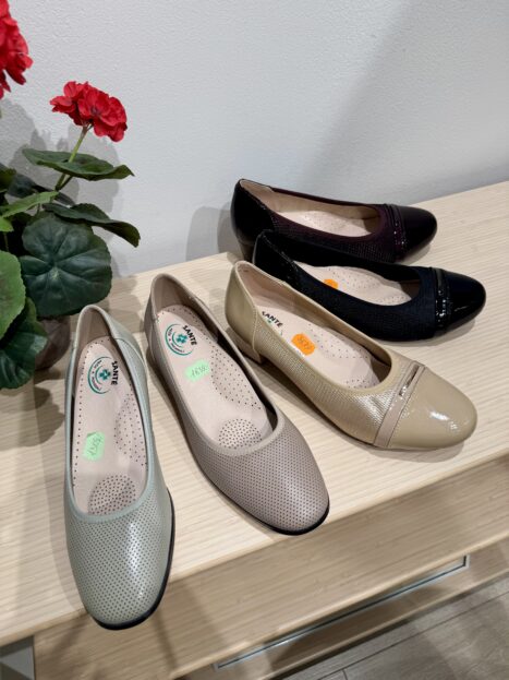 Obuv Santé má vždy anatomicky tvarovanou stélku – ve variantách i pro řešení různých problémů s chodidly. Vždy je při střihu obuvi brán v potaz i dostatek místa na prsty, podpatky bývají vždy nižší, jsou stabilní a vhodné i pro delší nošení.