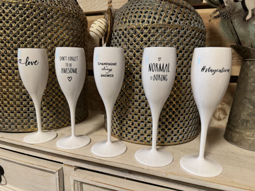 Stále tu pak vyberete i skleničky na prosecco z recyklovatelného plastu – od německé firmy Koziol. Opět s mnoha vtipnými, výstižnými nápisy.
