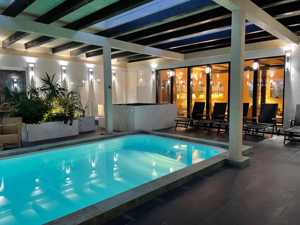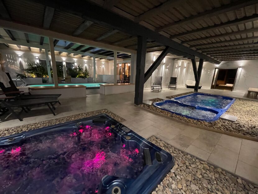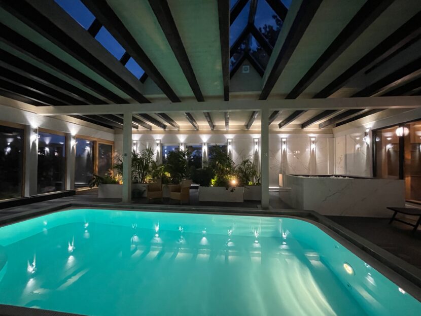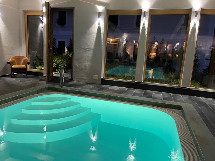K dispozici je vám zastřešený venkovní bazén s perličkovou vanou – na střeše jsou ponechané vikýře, máte tedy stále pocit, jako byste se koupali venku. Voda zde má příjemnou teplotu po celý rok.