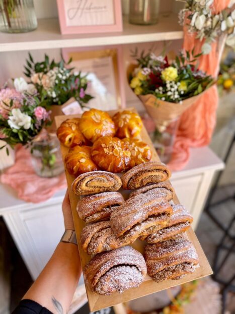 Ochutnáte i novinky –  nejrůznější dortové řezy, pistáciové věnečky, každou středu jsou v nabídce i vynikající moučníky, záviny, frgály… A pravidelně v úterý si tu můžete koupit i čerstvé, domácí pečivo – bagety, toustové chleby! A nesmím zapomenout i na květinový stánek s květinami od Hübnerová decoration – ten bude v čase adventu doplněný o vánoční dekorace.