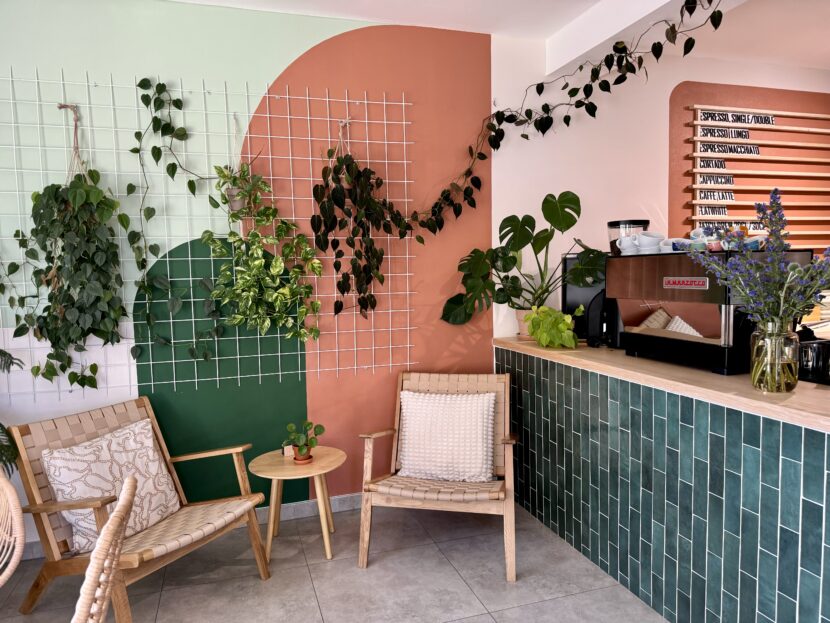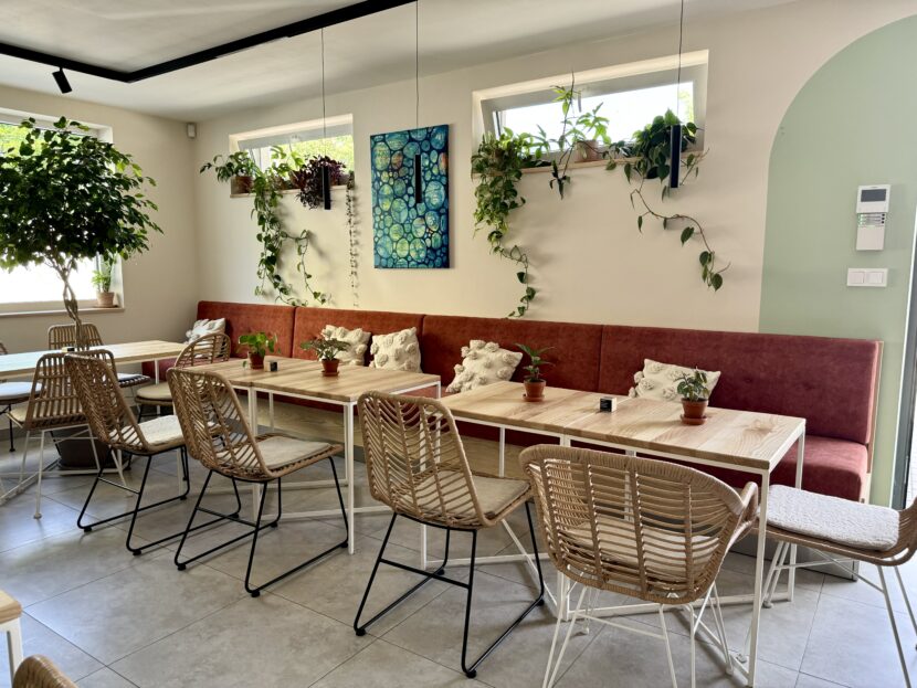 Prostory kavárny vás určitě nadchnou – mně se tu líbilo opravu moc. Prostředí je vzdušné, příjemné, plné rostlin, květin – kavárna se přece jmenuje „Lístek Kafé“, tak jsou živé dekorace z rostlin více než příhodné. :)