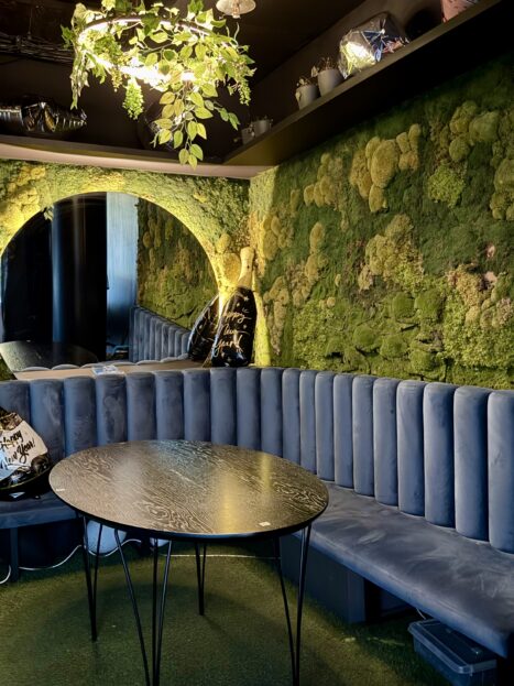 Luxusní dojem prostorům pak dodávají i květiny, pohodlná sametová křesla a sedačky a také, podsvícený bar v popředí.