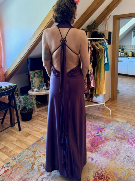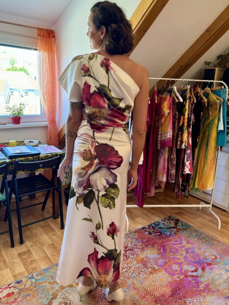 Šaty jsou velmi zajímavé i střihově – každá kousek je střihem unikát. Překvapilo mě často důmyslné řasení, průstřihy na zádech, ramenou, prodloužené díly šatů, rozparky, atypické uvazování kolem krku…