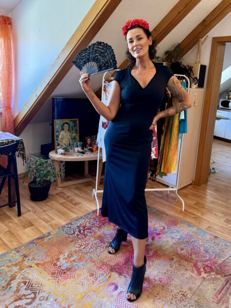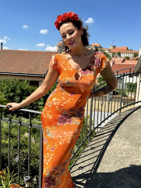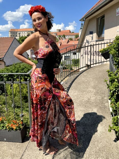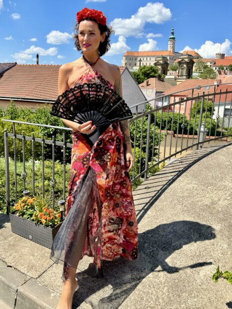 Stylově jsem šaty Evy barevné, mnohé až ve španělském stylu – dokonale se doplňují třeba s květinovými čelenkami!