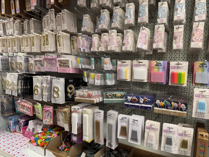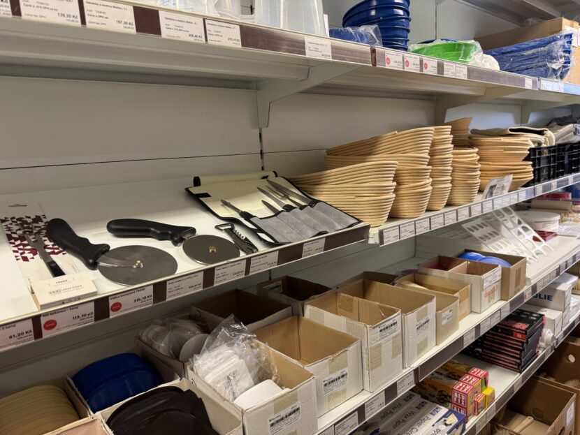 Koupíte tu pak i náčiní – vály, válečky, nejrůznější mísy a ošatky, plechy, mísy, ošatky na chleba a pečivo, potřeby pro pečení dortů, formy, svíčky na dorty, potravinářské barvy, marcipány a potahovací hmoty snad ve všech barvách, jedlé dekorace na zdobení….