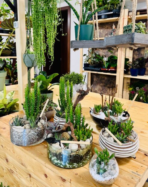 Doplňkový sortiment tu pak tvoří i obaly na květiny, mechové obrazy, rostlinná terária, květinové mísy s aranžovanými květinami, nebo s menšími pokojovkami.
