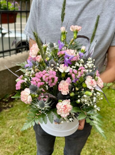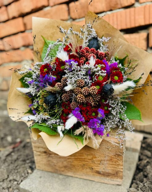 Mimo vázané kytice vás tu osloví i flower boxy – opět vám rádi zhotoví také na přání – s výběrem velikosti, barev, nebo druhů květin.