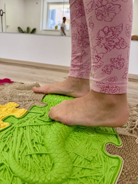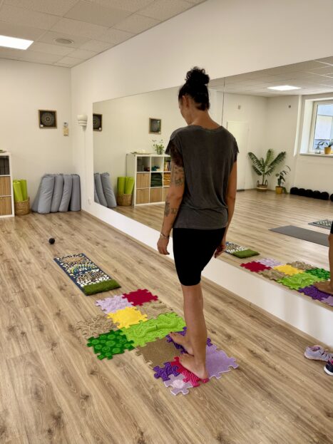 Během lekcí se využívají také různé pomůcky, ortopedické podložky…
