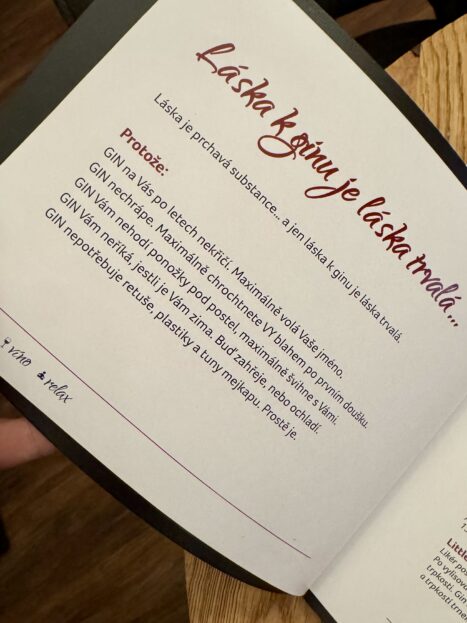 Troufám si napsat, že i díky výjimečnému prostředí opravdu nemá tento podnik konkurenci. A také – tak pestrou nabídku ginů, také naleznete jen málokde! Na giny se tu totiž zaměřují! Nové je zde dokonce speciální ginové menu, kde můžete vybírat z neuvěřitelných 74 ginů! Znalce pak potěší i ginové speciality – třeba lanýžový gin! Určitě vás také nadchne, že ke každému z ginů vám paní majitelka ráda poví spoustu zajímavých informací. Zkrátka, giny tu mají rádi.